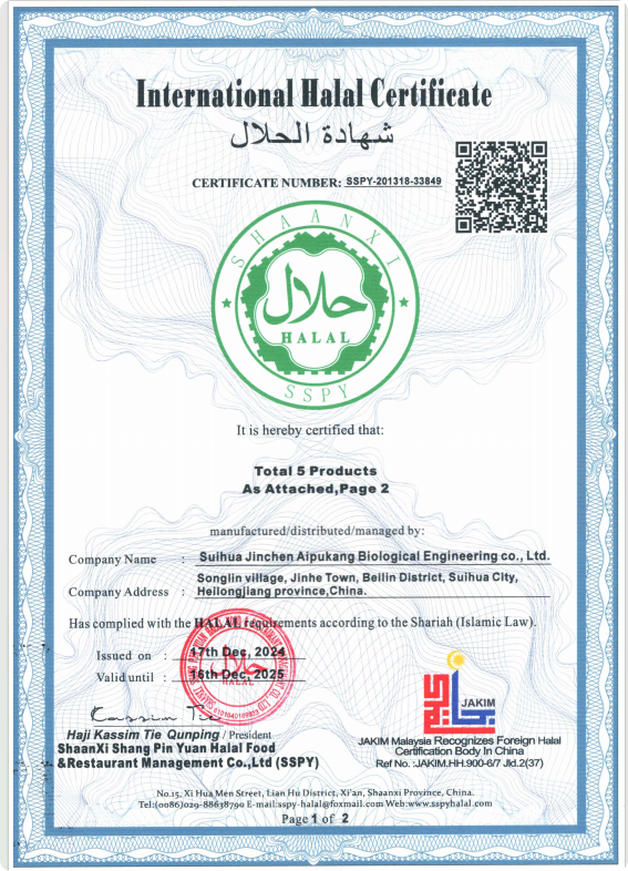 綏化金晨愛普康生物工程有限公司已成功通過出口企業(yè)的HALAL認證